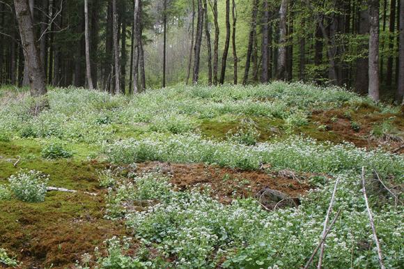 "Löffelkraut-Landschaft" bei Ottobeuren - eines der größten Vorkommen im AllgäuDas Bayerische Löffelkraut (Cochlearia bavarica) gehört zur Familie der Kreuzblütler (Brassicaceae). Vor allem in den Monaten Mai bis Juni kommen die weißen Blüten zur vollen Entfaltung. Die Art ist nach der letzten Eiszeit aus einer Kreuzung des Pyrenäen-Löffelkrautes (Cochlearia pyrenaica) mit dem Echten Löffelkraut (Cochlearia officinalis) entstanden. Alle drei Arten sehen sich sehr ähnlich und sind damit leicht zu verwechseln. Das Bayerische Löffelkraut ist ein ausgesprochener „Spezialist“, der ausschließlich an Quellen und Quellbächen wächst. Die Wuchsorte zeichnen sich durch relativ konstante Temperaturbedingungen aus (ca. 6 bis 8 °C) und sind auch in kalten Wintern häufig schnee- und eisfrei. Meist sind die Standorte auch durch flächige Vorkommen des Starknervmooses (Cratoneuron commutatum) und Tuffsteinbildungen geprägt.